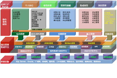 施工总承包企业解决方案构成1、综合项目管理系统方案 施工总承包企业项目管理信息系统要覆盖进度、成本、合同、物资、设备、质量、安全、风险管理内容。 2、工程设计管理系统 可以实现对工程图纸的全生命周期管理,包括建立设计人员个人图档资料库、图纸添加上传,图签和图纸编目管理,实现数据库与项目图纸图签信息的双向流动,图纸设校审流程审批事务管理,已完成图纸归档和出图提交。 "项目打包"可以将项目已上传的图纸按项目树结构打包输出,方便图纸提交及光盘备份。同时提供"历史版本"管理,帮助设计人员管理各阶段设计成果。 3、人力资源管理系统 针对集团公司的人力资源进行统一管理。主要包括:招聘管理、员工档案管理、薪酬福利管理、考勤管理、人事管理、合同管理、薪资管理、培训管理、绩效管理等。 4、档案资料管理系统 结合档案资料管理的有关规定,具备档案分类目录建立、各类文档资料录入、项目档案归档、档案查询、资料借阅管理等功能; 5、办公自动化及门户网站 各部门通过门户网站登陆内部OA办公自动化平台中,维护外部网站数据,控制企业网站信息的显示,使企业的信息快速及时的在公司网站中更新显示,保持网站信息的及时更新。 6、决策支持系统 主要面向决策层和有需要的管理层。对项目和管理过程中的动态情况进行跟踪和报表统计。从各个维度和角度进行数据的挖掘,使领导层能对项目的进度、招投标情况、进度、成本、合同、资金的情况进行跟踪和查询。 7、企业知识库 企业知识库主要是对企业的定额、企业的规章制度、标准图集、工程规范、合同范本等进行管理,实现知识资产采集、知识资产传递及利用、知识资产创新、教育培训、效益分析和知识资产的保护等功能,为企业日常管理需要提供支持、借鉴和参考。